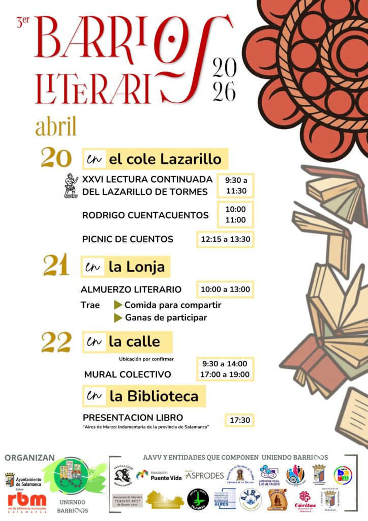 📚 ¡Vuelven los Barrios Literarios! Del 20 al 22 de abril, el Trastormes se llena de actividades para todas las edades: lectura del Lazarillo, cuentacuentos, almuerzo literario, mural colectivo y mucho más.