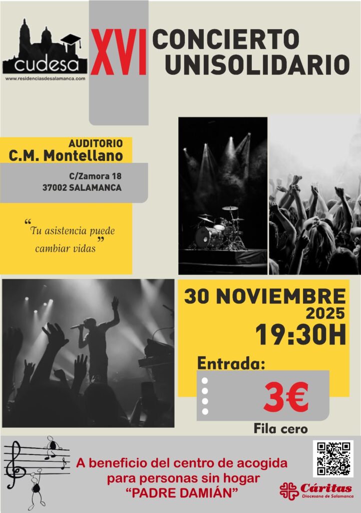 Los Colegios Mayores y Residencias Universitarias de Salamanca celebran el XVI Concierto Unisolidario el domingo 30 de noviembre, a las 19:30 h, en el Colegio Mayor Montellano (C/ Zamora, 18). Las entradas tienen un coste solidario de 3 € y se pueden recoger en el mismo colegio. Además, también existe la opción de colaborar mediante fila 0. La recaudación irá destinada a nuestro Centro de Acogida Padre Damián. Una propuesta cultural que une música, convivencia y solidaridad en apoyo a las personas sin hogar.