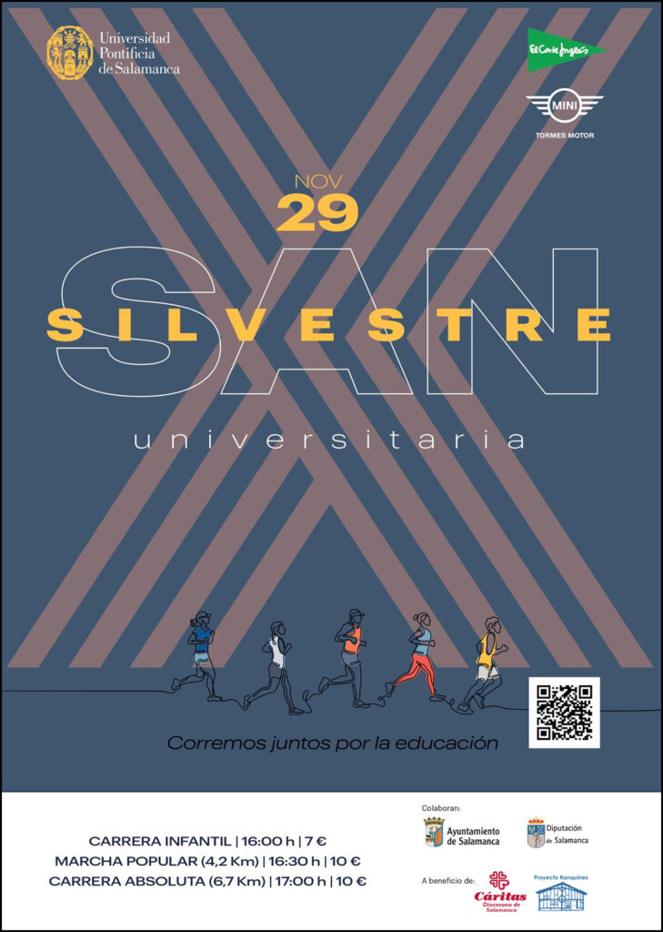 La Universidad Pontificia de Salamanca celebra este sábado su X San Silvestre Universitaria. Una cita deportiva y solidaria cuya recaudación se destinará al Centro de Día de salud mental Ranquines de Cáritas. La prueba absoluta comenzará a las 17:00h, con un recorrido de 6,7 km, además de contar con carreras infantiles (desde las 16:00 h) y una marcha popular de 4,2 km (16:30 h).