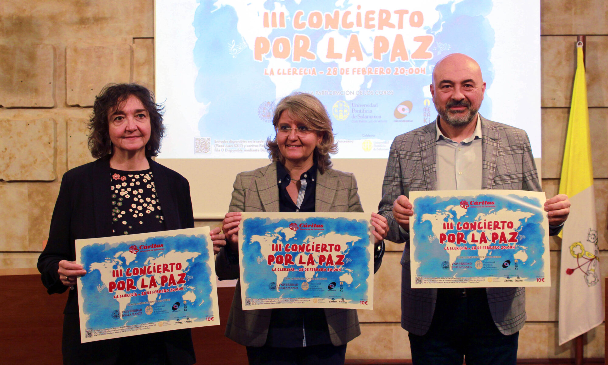 Cáritas Diocesana de Salamanca ha presentado esta mañana en rueda de prensa su III Concierto por la Paz; una iniciativa solidaria que se celebrará el sábado 28 de febrero, a las 20:00 horas, en la Iglesia de La Clerecía, con el objetivo de recaudar fondos para acompañar a personas y familias en situación de vulnerabilidad. El acto de presentación ha tenido lugar en la Universidad Pontificia de Salamanca, entidad colaboradora que acoge esta propuesta cultural y solidaria.