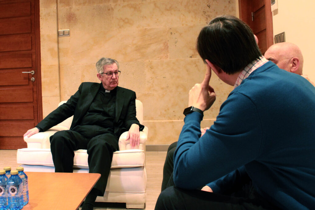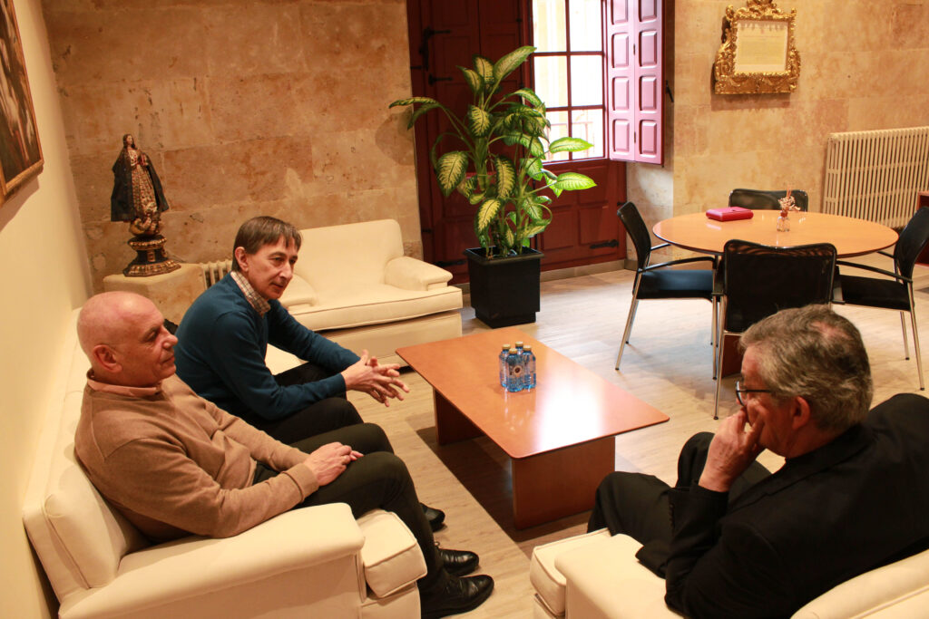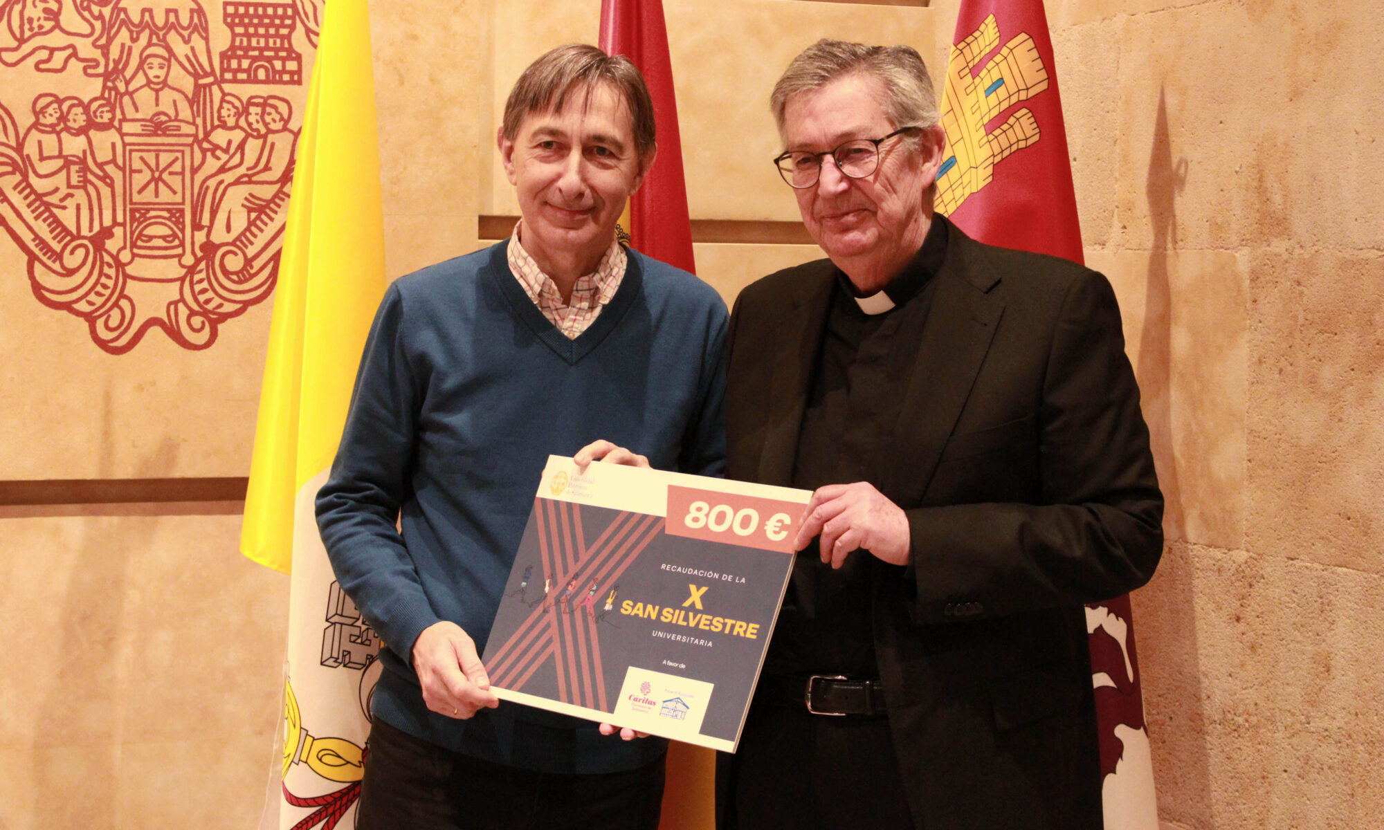 El Rector, Santiago García-Jalón, ha entregado al director de Cáritas Diocesana de Salamanca, José Manuel Lázaro Uriol, la recaudación obtenida con la venta de dorsales de la X San Silvestre Universitaria, celebrada el 29 de noviembre de 2025.