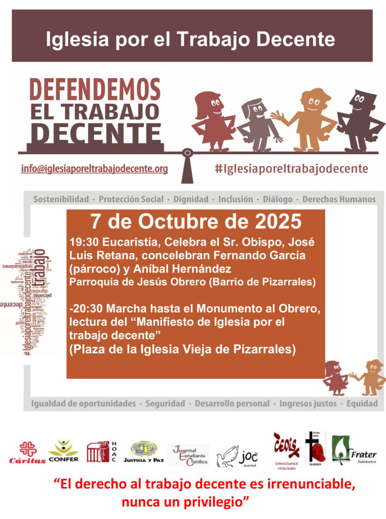 Los actos en Salamanca comenzarán a las 19:30 horas en la parroquia de Jesús Obrero, en el barrio de Pizarrales, con la celebración de la Eucaristía, presidida por nuestro obispo, Mons. José Luis Retana. Tras la misa, se realizará un gesto público de compromiso: una marcha hasta el Monumento al Obrero, donde se leerá el manifiesto de ITD 2025, reivindicando un trabajo digno para todas las personas.
