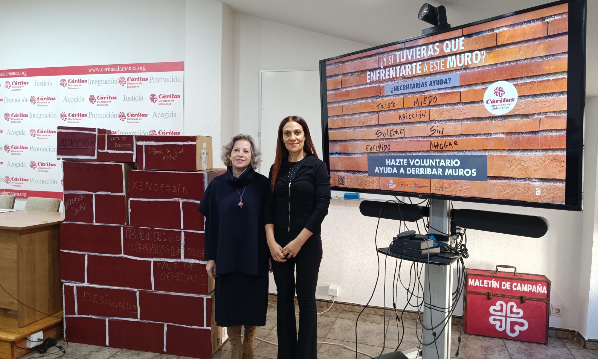 Cáritas Diocesana de Salamanca ha presentado esta mañana en su sede “Ayuda a derribar Muros”; su nueva campaña de promoción del voluntariado, fruto de la colaboración anual con los alumnos de ‘Estrategia Creativa publicitaria’ de la Universidad Pontificia. Un acto en el que han intervenido Rosa Hernández, responsable del programa de voluntariado de Cáritas, y Carmen María Alonso, catedrática de la Facultad de Comunicación.