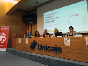 La mesa estuvo compuesta por Almudena Iglesias, coordinadora del programa con personas privadas de libertad de Cáritas Salamanca; Marta Pérez, subdirectora de tratamiento del Centro Penitenciario de Topas; Cristina Filardo, trabajadora social del mismo centro; y Carlos Gaspar, interno en pleno proceso de reinserción.