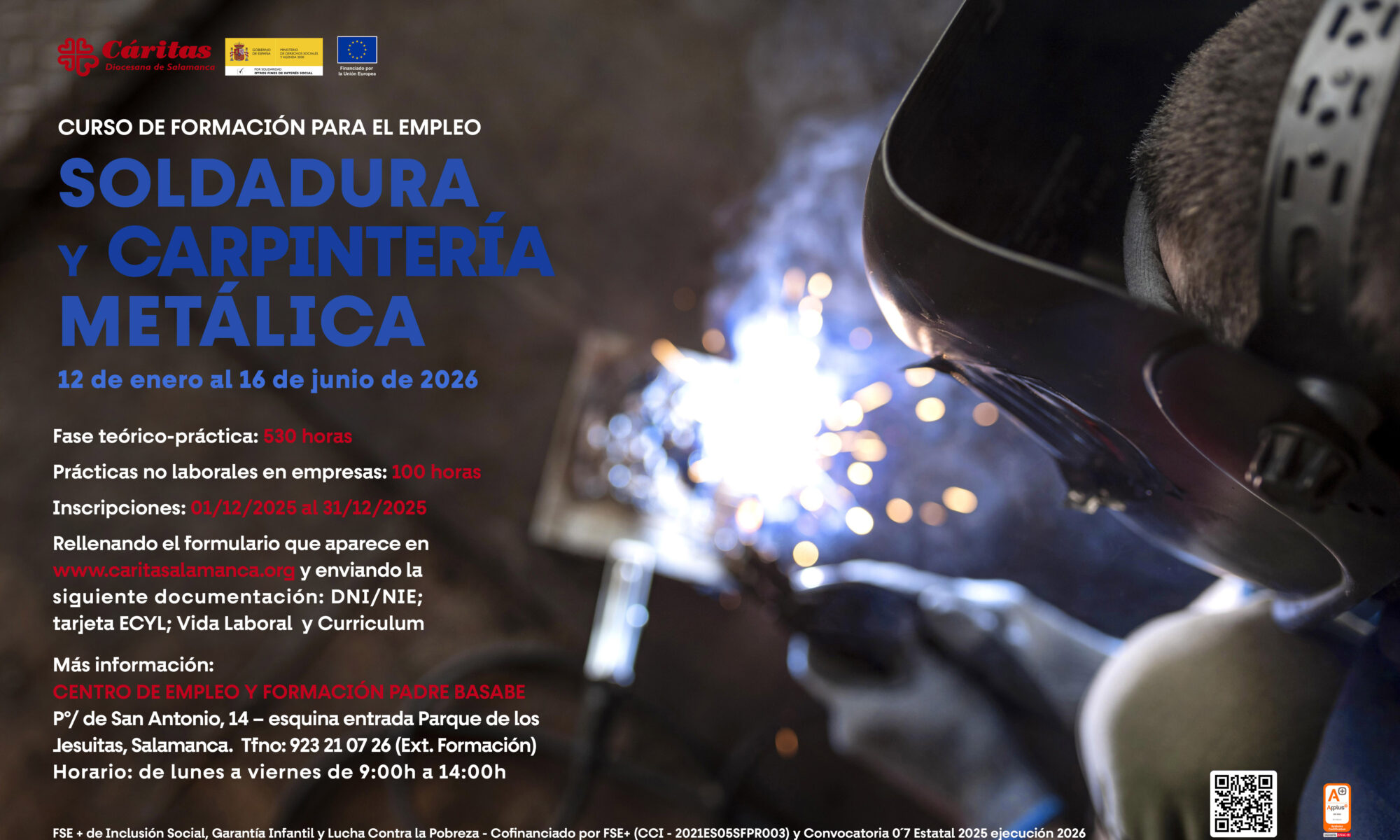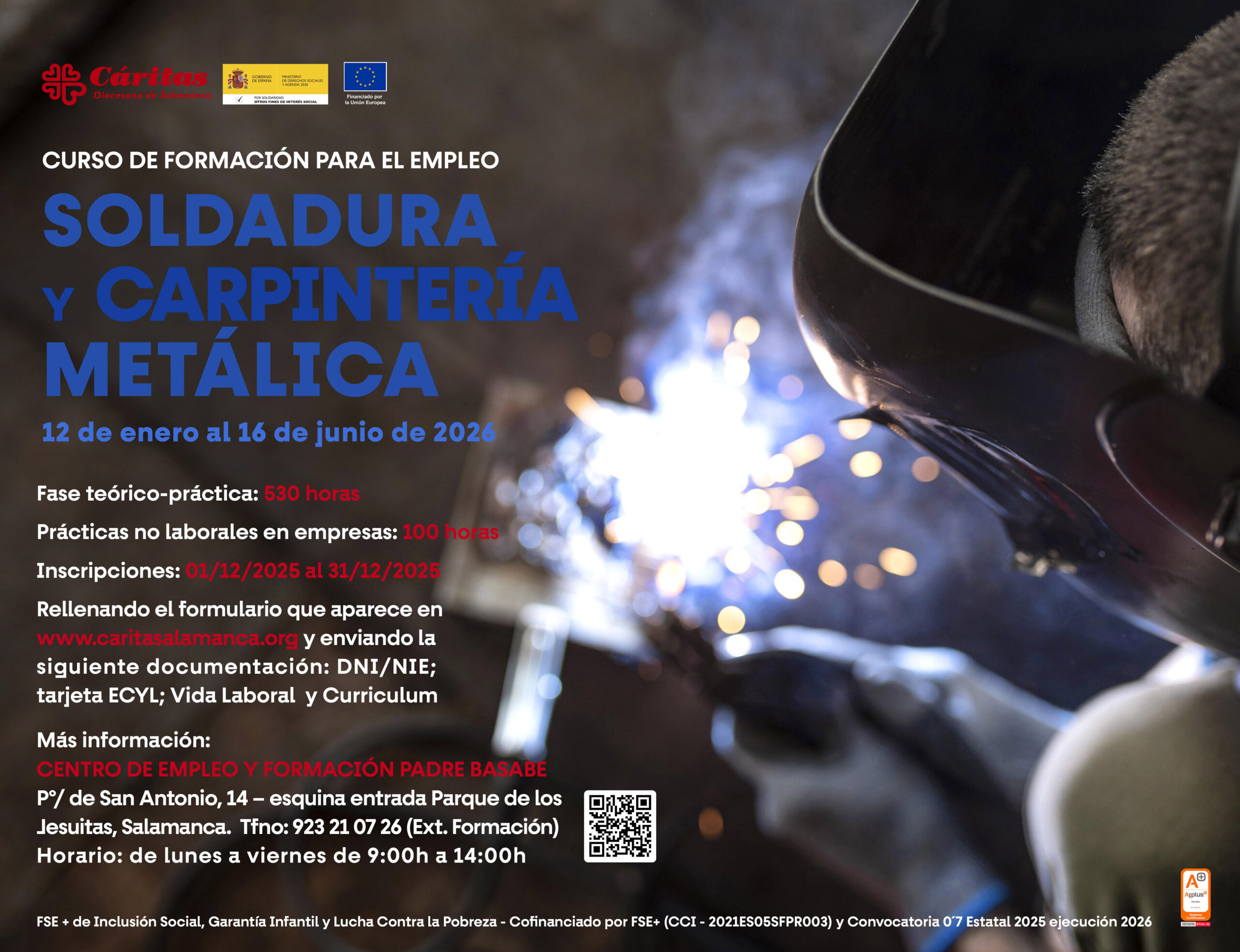 Abrimos la convocatoria del Curso de Formación en Soldadura y Carpintería Metálica (3986 – CDSAL-FORMACION-CURSO SOLDADURA Y CARPINTERIA METÁLICA). Una formación teórico-práctica completa, orientada a la adquisición de competencias profesionales en el oficio.