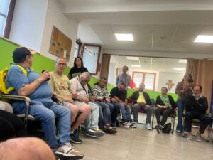 La mañana comenzó con una bienvenida significativa, preparada con especial cariño: música suave, un cartel de bienvenida y una recepción decorada con fotografías del curso anterior. Tras unas palabras de apertura de Gema, que agradeció el reencuentro y recordó lo vivido, el grupo participó en un círculo compartido. Con una madeja de hilo que iba pasando de mano en mano, cada persona respondió a preguntas como “¿Qué me ha sostenido este verano?” o “¿Qué quiero tejer este curso en mi vida?”. El hilo fue tejiendo literalmente una red que simbolizó la unión y el cuidado mutuo que caracteriza al proyecto.