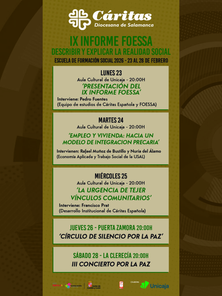 La Escuela de Formación Social 2026 de Cáritas Diocesana de Salamanca se celebrará este 2026 del 23 al 28 de febrero y se presenta como un espacio de referencia para la reflexión y el compromiso con los desafíos sociales actuales. Una sjornadas que cuentan con la colaboración del banco Unicaja, y que están dirigidas a agentes sociales, profesionales, voluntariado y ciudadanía interesada en comprender y transformar la realidad social desde una mirada crítica, solidaria y comprometida.