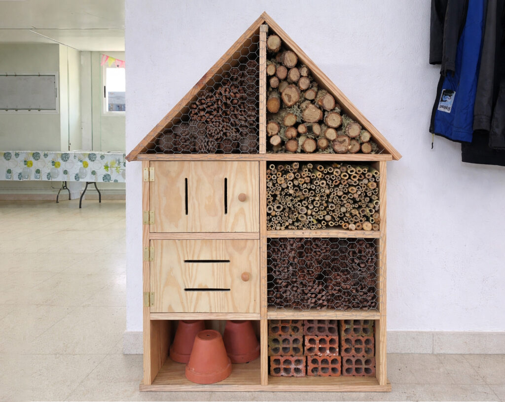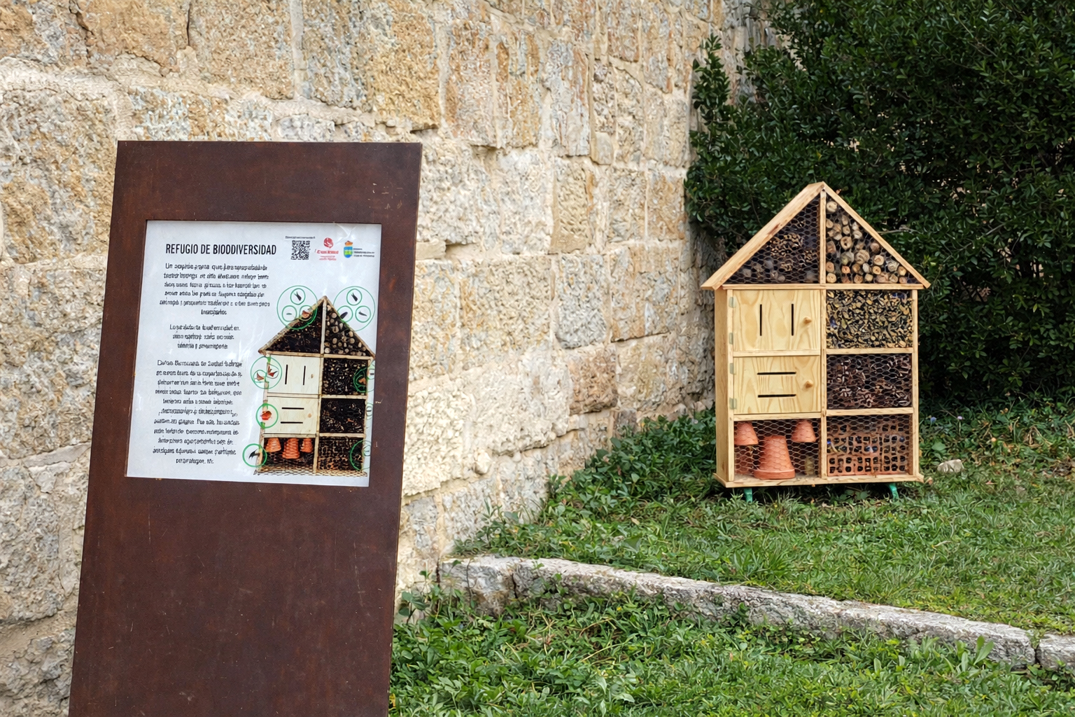 Lo primero que se hace es instalar un hotel de insectos con diferentes compartimentos, acompañado de una placa que contiene un código QR en que se remite a la web donde explican para que sirve cada uno de los huecos