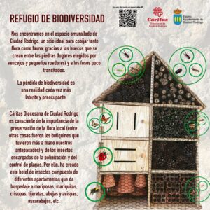 Hoy queremos compartir un proyecto de Cáritas muy novedoso, que lleva algo más de un año funcionando en Ciudad Rodrigo, orientado a la sensibilización ambiental. Para ello, nos ponemos en contacto con Rodrigo Sierra, técnico del servicio de empleo y formación de Cáritas Diocesana de Ciudad Rodrigo. Se trata de un espacio de biodiversidad, donde poner en valor la importancia del equilibrio natural. Dentro de este espacio, han comenzado con la instalación de un hotel de insectos.