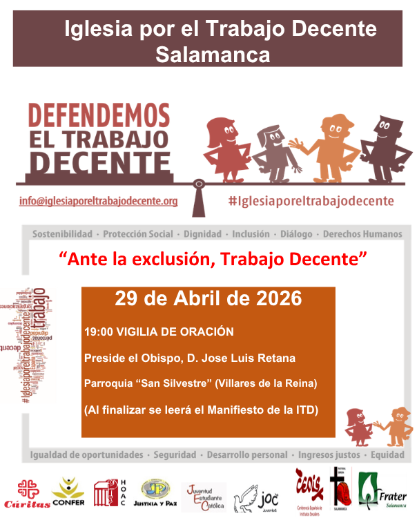 La plataforma Iglesia por el Trabajo Decente (ITD), integrada en la Diócesis de Salamanca por Cáritas, CONFER, HOAC, Pastoral del Trabajo, JEC y FRATER, convoca una vigilia de oración el próximo 29 de abril, a las 19:00 horas, en la parroquia de Villares de la Reina, con motivo del Día Internacional de los Trabajadores, que se celebra el 1 de mayo, en la festividad de san José Obrero.